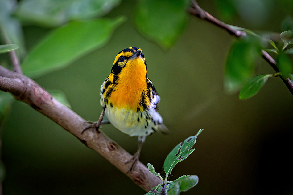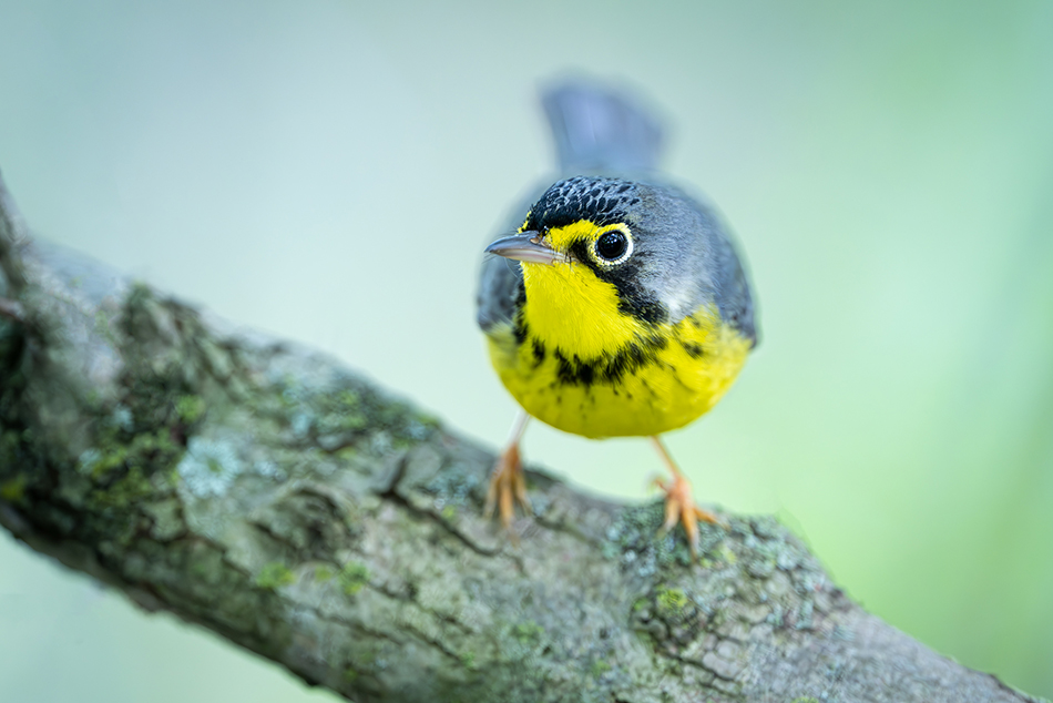 One creative note about photographing close warblers at 560mm F4. Fast lenses are nice to allow you to use lower ISO settings and faster shutter speeds in low light. But F4 does not produce a lot of depth of field at 560mm. Take a look at this Canada warbler image. The eye and face is sharp, but the rest of the bird gets a soft blur, what you would expect using this lens very close to your subject. Some photographers may want the entire bird tack sharp, so you could use an aperture like F16, or wait for the bird to be broadside and get better acuity on the entire bird. I’ve always preferred to approach bird photography like other genres…I want to create mood and feeling in an image, which shallow depth of field can produce. I’m not about recording the species, I’m more interested in creating evocative images. This is subjective, so decide ahead of time your approach to photographing warblers. What do you like in your bird images, and what is the end use?
