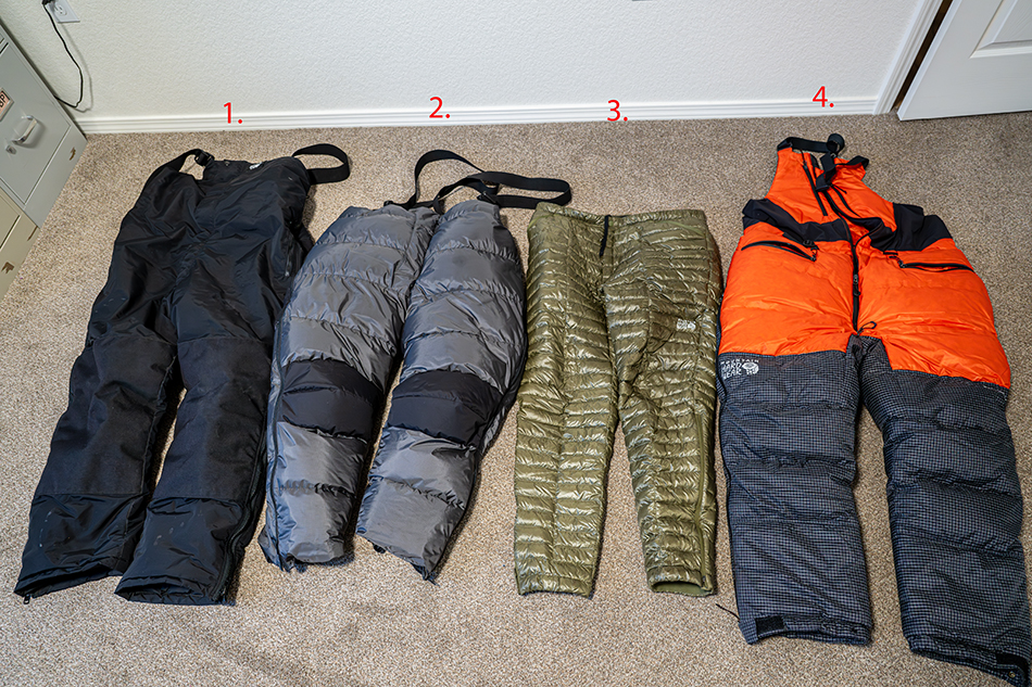 Feathered Friends Frontpoint Expedition Down Pants (2.). These are the warmest stand alone down pants I own. With my Patagonia heavy weight long johns layered underneath, I’m good to -30F wearing these pants. They are packed with 900+ fill down, and have a waterproof durable Pertex fabric. And they are incredibly light. My only wish is they made them in a bib to better seal out the cold along the waistline.